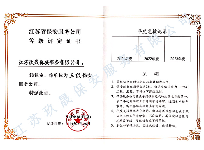 江蘇玖晟保安服務有限公司成立于江蘇省昆山市千燈鎮。注冊資金:2000萬,是擁有省公安廳頒發的保安服務許可證的企業【蘇公保服20170046】,也是昆山市保安協會常務理事單位。